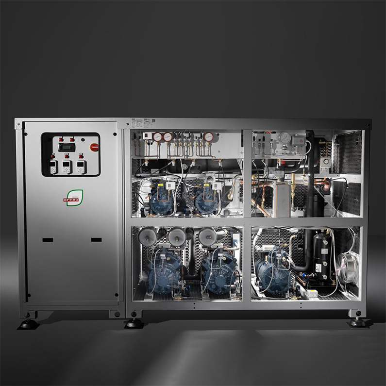 The transcritical CO2 rack Mini Booster, is suitable for medium and low temperature applications operating in small – medium supermarkets. The cooling capacity is between 25 and 95 kW for MT applications, 5 to 25 kW for LT applications. The system uses 3 compressors in MT (2 MT + 1 parallel compressor or 3 MT) and 2 or 3 compressors in LT.